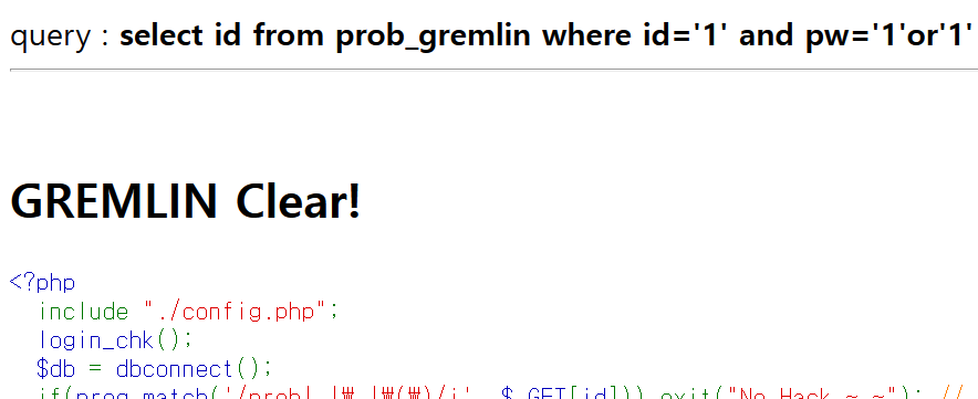 {$_GET[id]}와 {$_GET[pw]} 자리에 우리가 입력한 값이 들어가게 되고, 만약 우리가 정답에 적힌 내용을 요청하게 되면 다음과 같은 쿼리문이 완성된다. => select id from prob_gremlin where id='0' and pw='1'or'1'