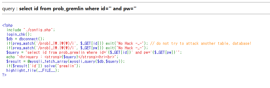 select id from prob_gremlin where id='{$_GET[id]}' and pw='{$_GET[pw]}'