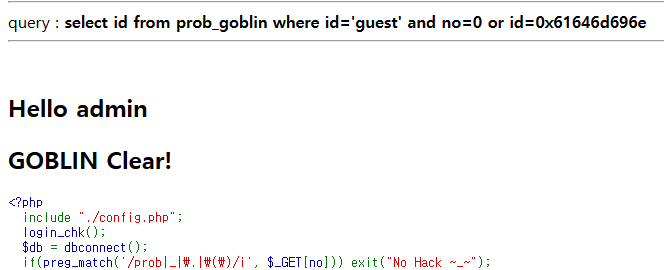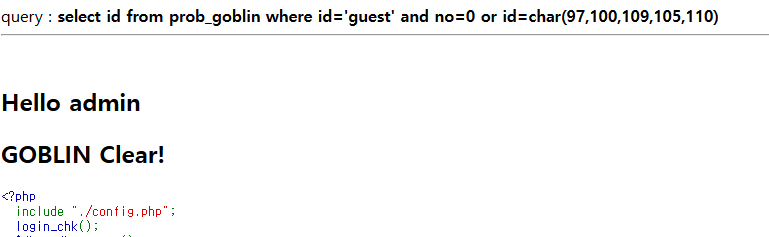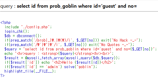 4. if($result['id'] == 'admin') : 질의 결과 id가 admin일 경우 solve("goblin")을 시켜줌