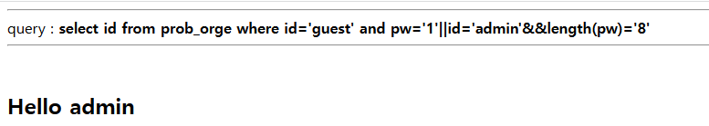 [ 문제접근 ] 1. 쿼리 : id는 admin으로 고정되어 있고 pw가 존재, 이를 통해 DB를 조회한다 2. $_GET[pw] : GET방식을 통해서 pw를 입력을 받는다 3. if(($result['pw']) && ($result['pw'] == $_GET['pw'..