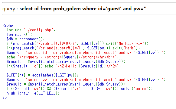 1. if(preg_match('/or|and|substr\(|=/i', $_GET[pw])) exit("HeHe"); : or,and,substr,= 문자열을 필터링함