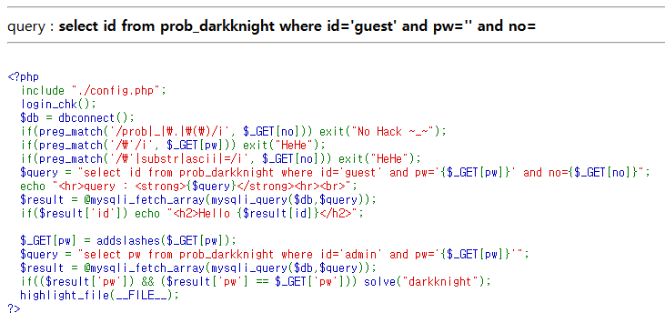 1. if(preg_match('/\'/i', $_GET[pw])) exit("HeHe"); , if(preg_match('/\'|substr|ascii|=/i', $_GET[no])) exit("HeHe");